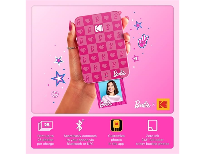 BARBIE X KODAK: ICONICA E STILOSA Entra in un mondo di glamour con la collaborazione Barbie x Kodak! Questa elegante stampante compatta e leggera stampa fino a 25 foto con una sola carica.